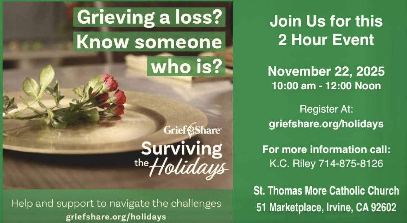Anyone who is grieving the loss of a loved one is welcome to join the GriefShare Event “Surviving the Holidays” being held at St. Thomas More on Saturday November 22nd from 10:00 AM – 12:00 Noon. It is an event designed to provide help for those who have suffered the loss of a loved one. It will provide you with some tools to help you go through the holidays as comfortably as possible. There will be a video and some discussion, served up with with holiday treats. Trust that God will be with you and that you are free to choose to do some things differently this year. REGISTER AT GRIEFSHARE.ORG/HOLIDAYS for this event.